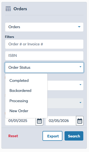 Exports may be narrowed using filters such as ISBN, order status, bill-to, and ship-to.